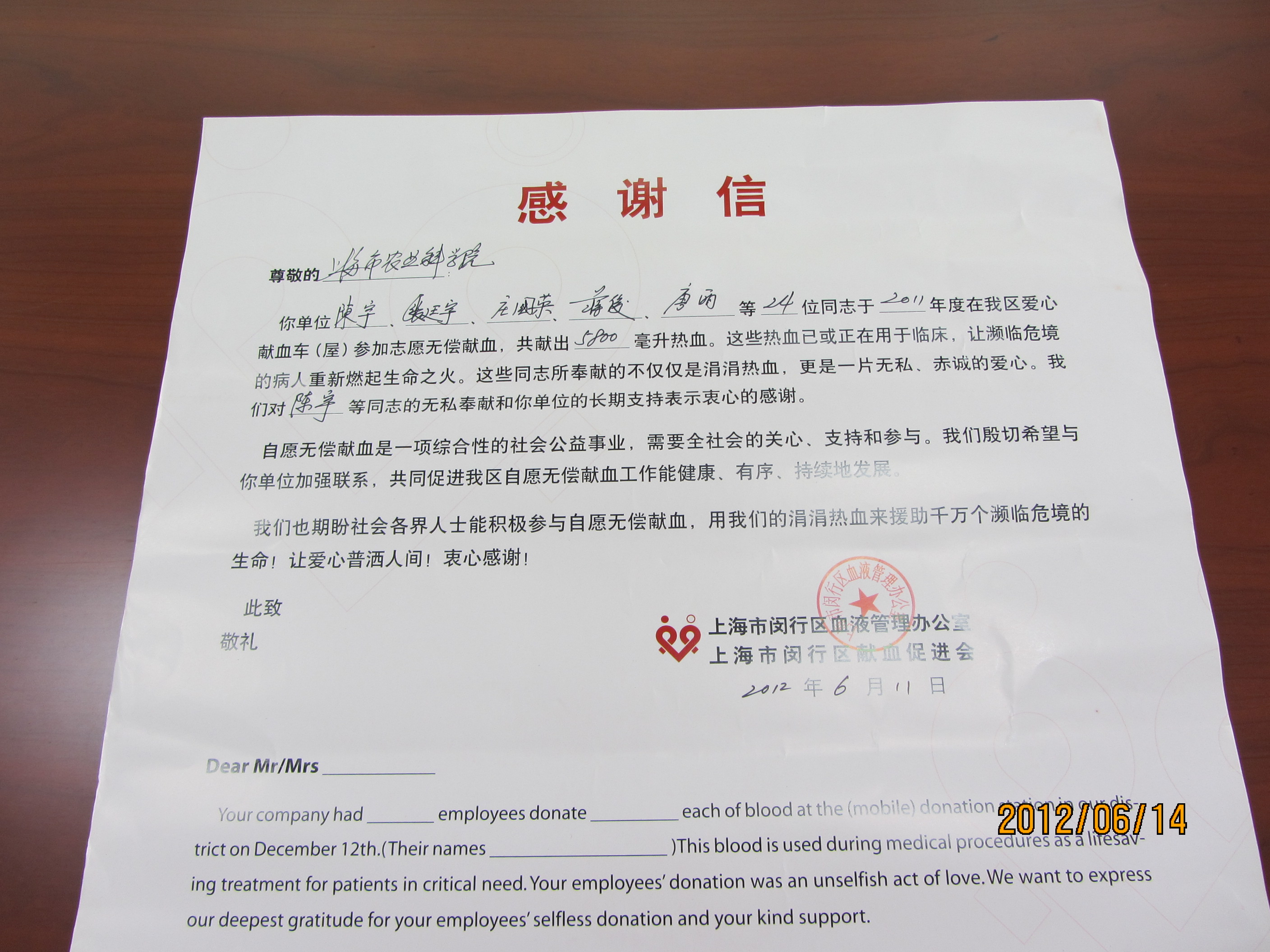 每个献血者都是英雄 来源: 作者: 发布时间:2012-06-15 00:00:00 浏览次数: 次 【字体:小 大】 6月14日是第九个世界献血者日,今年的主题是“每个献血者都是英雄”。在此之际,我院收到了闵行区血液办公室和闵行区献血促进会特致的感谢信,信中称每位献血者都是英雄,对我院陈宇、张廷宇、庄国荣、蒋俊、唐丽等24位同志在2011年度参加闵行区无偿献血,献出5800毫升涓涓热血表示感谢,尤其是畜牧所的张廷宇硕士在2011到2012年度分两次献全血800毫升。他们是英雄,向社会展示了助人为乐的精神风貌,演绎了中华民族的传统美德,值得我院上下崇敬、学习。 分享到: 【打印正文】