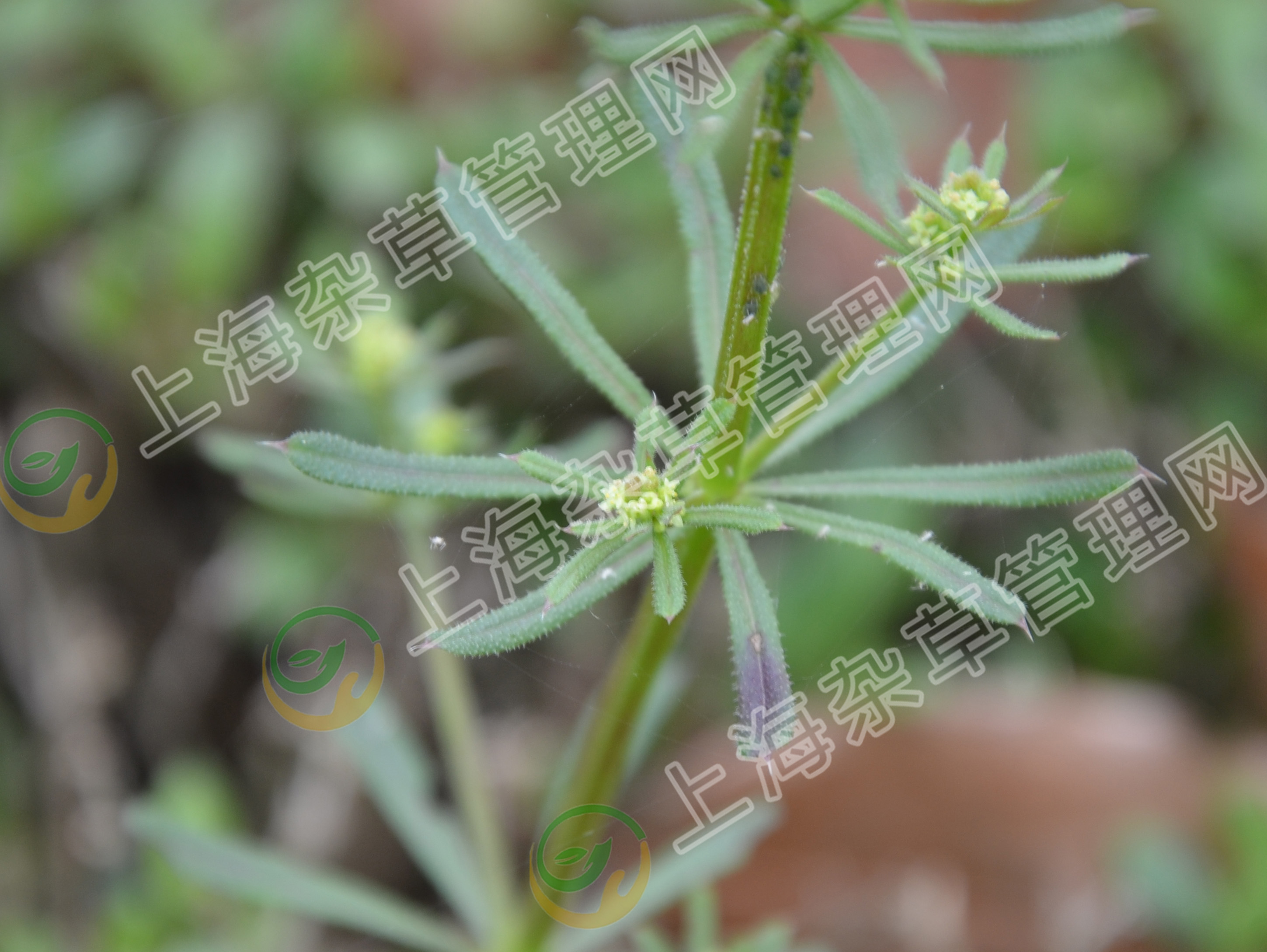 【识别特征】子叶阔卵形;下胚轴发达,带红色,上胚轴亦发达,呈四棱形,棱上生刺状毛,亦带红色;初生叶4片轮生,阔卵形;根带桔黄色;成株茎四棱,棱上和叶背中脉及叶缘均有倒生细刺,触之粗糙;叶(4)6-8片轮生,线状倒披针形,顶端有刺尖,表面疏生细刺毛;聚伞花序顶生或腋生,花小,花瓣黄绿色,4裂,辐状,裂片长圆形;果实球形,表面褐色,密生钩状刺毛,钩刺基部呈瘤状。花期4月,果期5月。