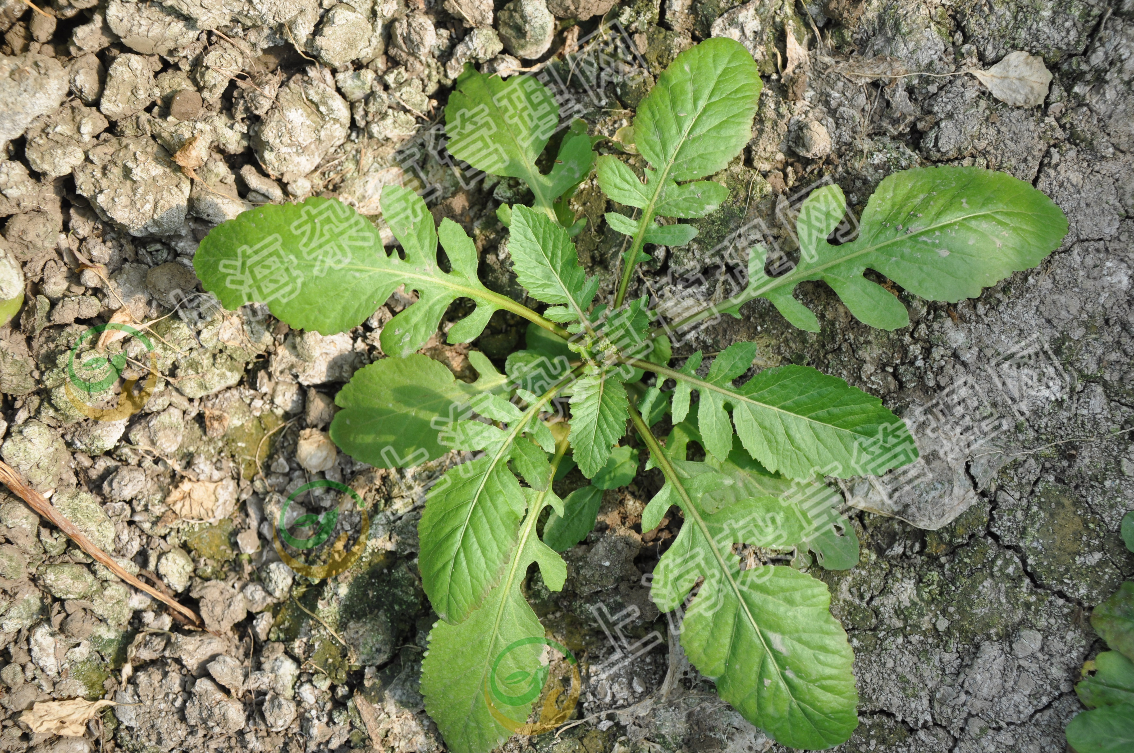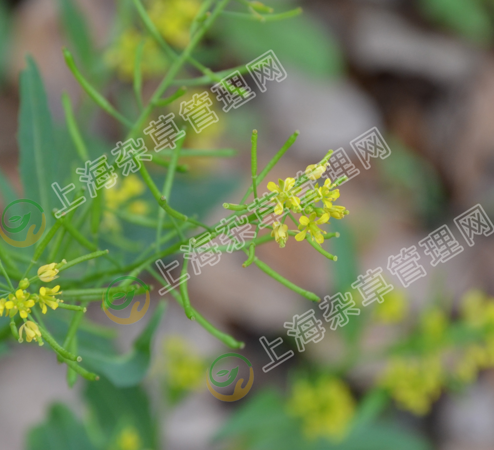 【识别特征】子叶阔卵形,先端微凹,具柄;初生叶1片,阔卵形,先端钝圆,叶基阔楔形,具长柄,叶脉不明显;成株高15-50cm,茎直立,粗壮,常带紫红色;基生叶和下部叶有柄,大头羽状分裂,上部叶长圆形,无柄;总状花序顶生,花小,黄色,花瓣匙形,基部渐狭成短爪;长角果圆柱形,斜上开展,稍弯曲,成熟时果瓣隆起;种子每室2行,细小,卵形而扁,一端微凹,褐色,表面具细网纹。花期4-6月,果期6-8月。