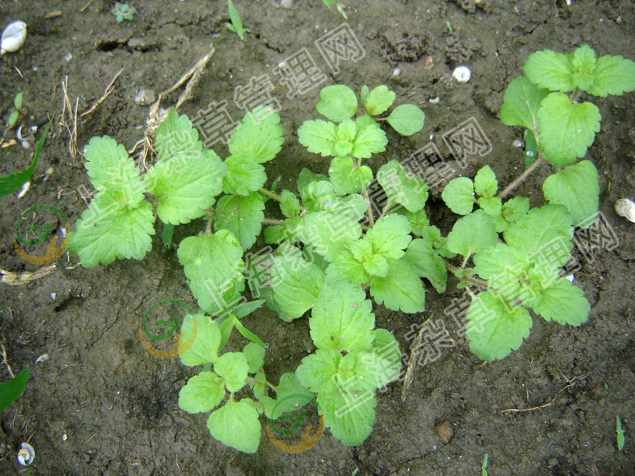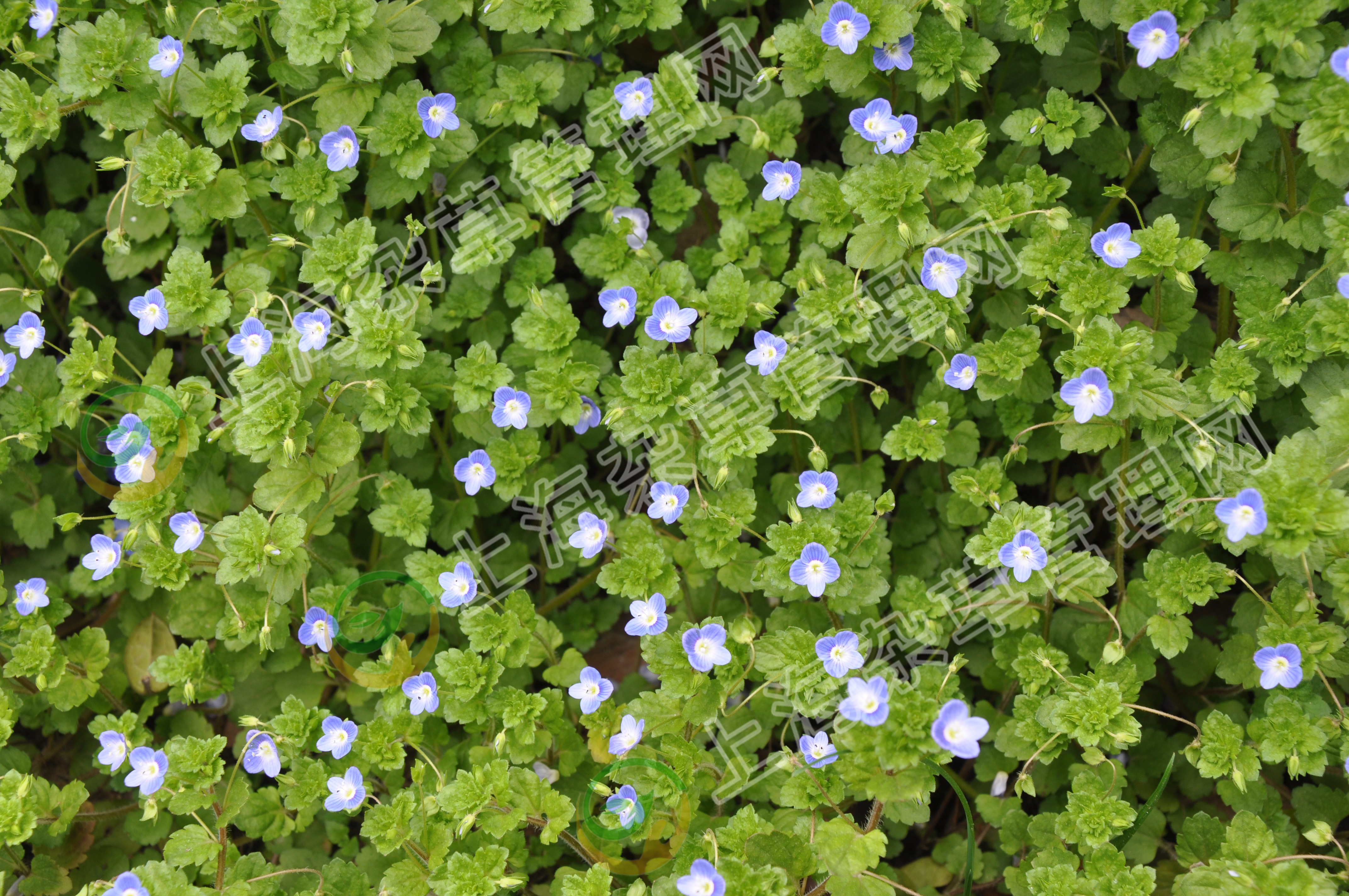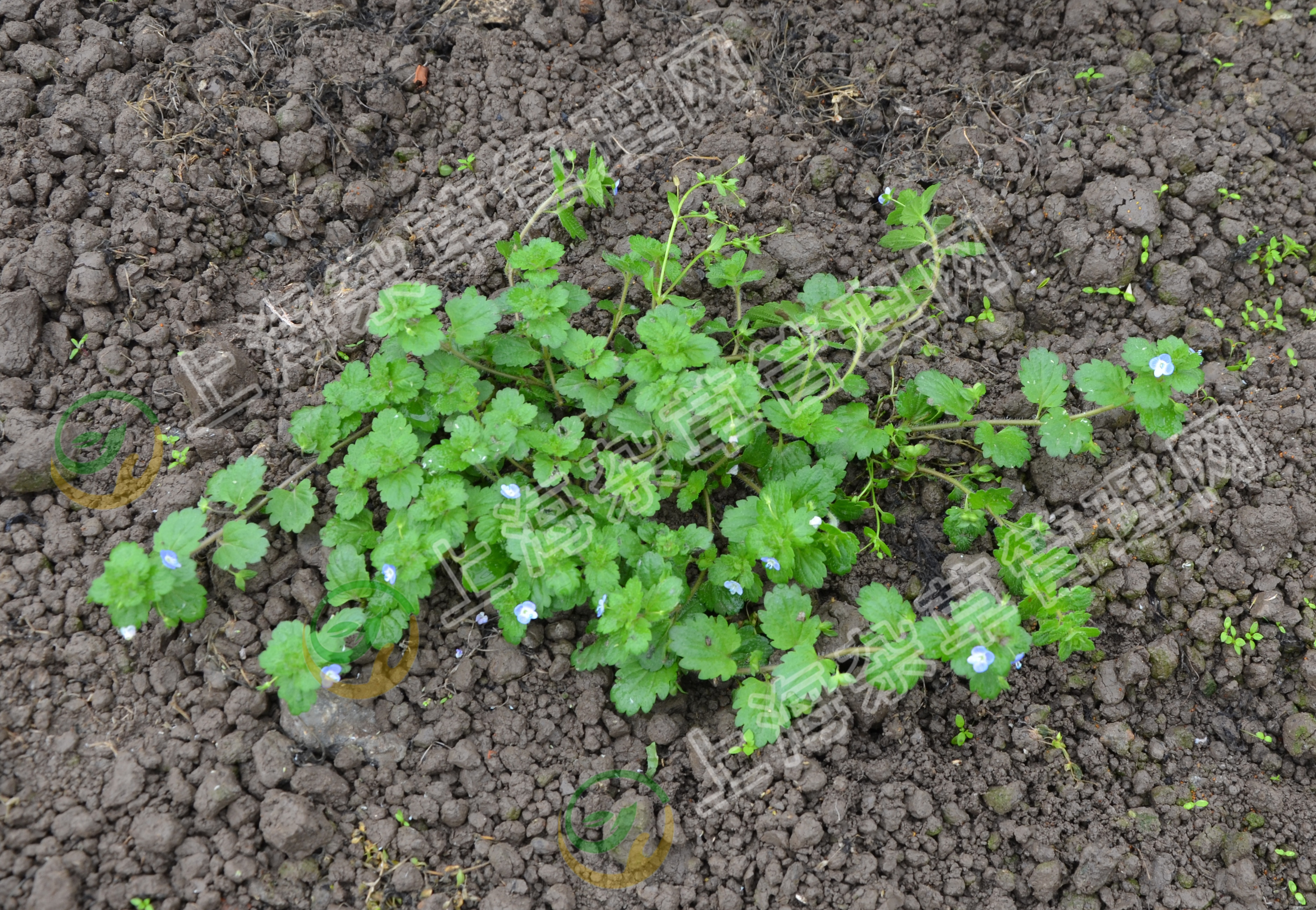【识别特征】子叶阔卵形;上、下胚轴均密被斜垂弯生毛;初生叶2片,对生,卵状三角形,缘具2-3个粗锯齿,具睫毛,叶脉明显,被短柔毛;成株全体被有柔毛;茎下部伏生地面,基部多分枝,斜上;叶在茎基部对生,上部互生,卵圆形及肾状圆形,缘具钝锯齿,基部圆形,下部的叶常有柄,上部的叶无柄;花单生于叶状苞片内,花冠淡蓝色,有放射状深蓝色条纹;蒴果倒扁心形;种子舟形或长圆形,表面有皱纹。花期3-4月,果期4-5月。