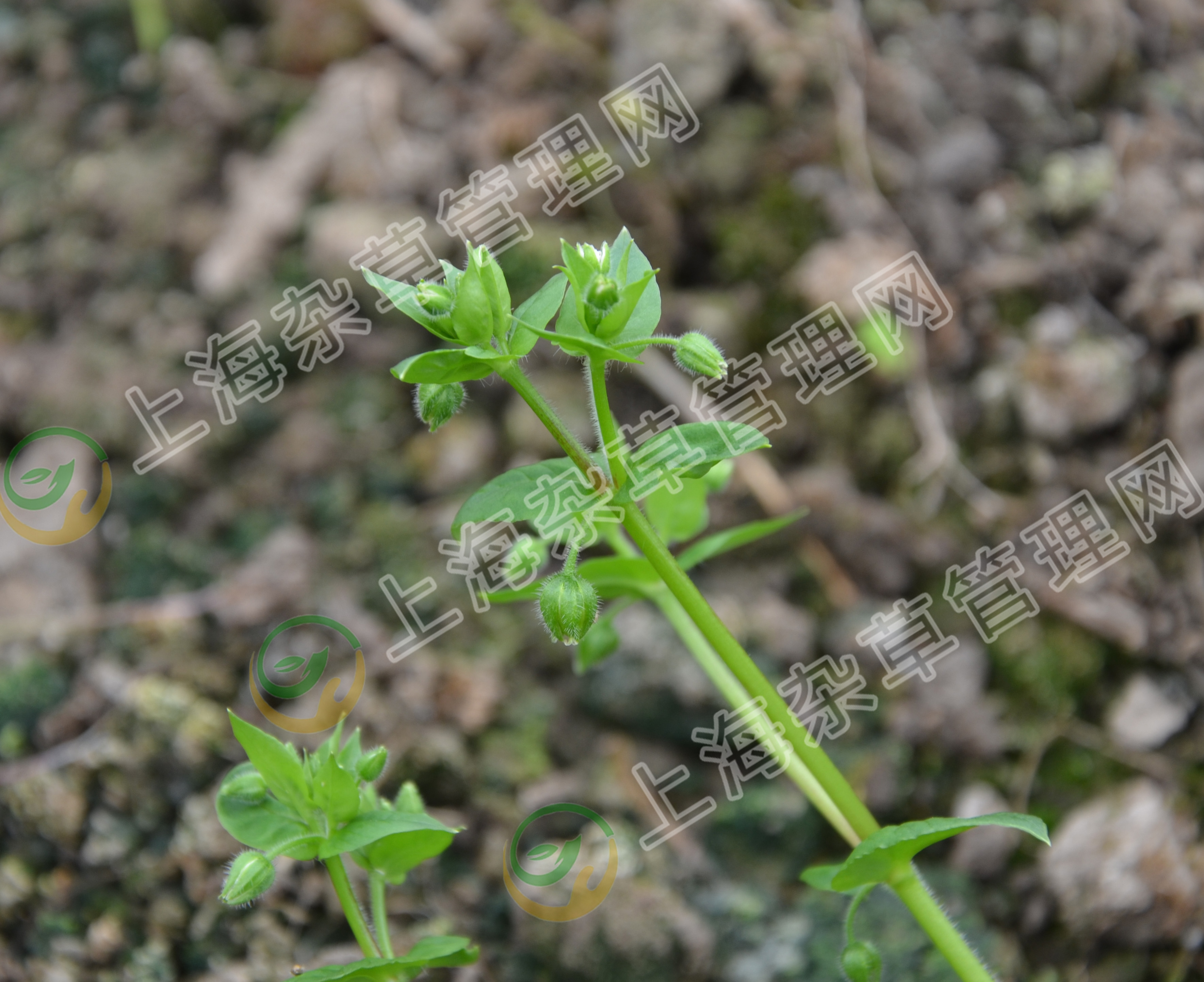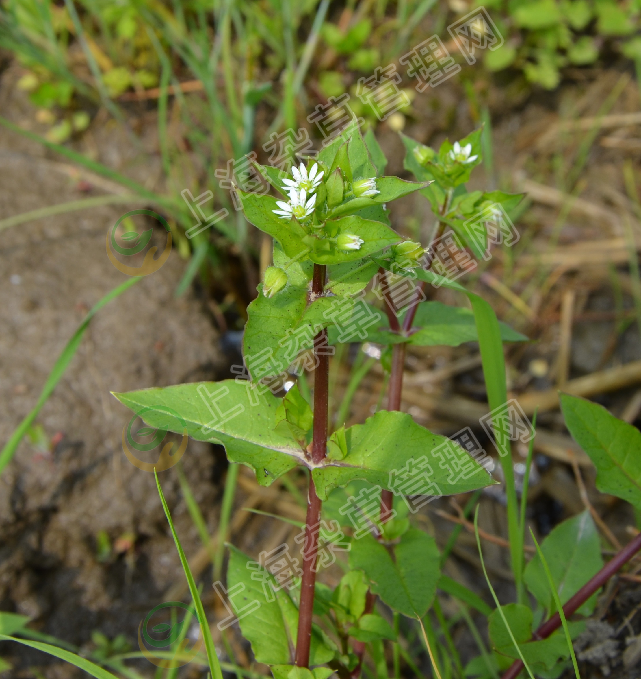 【识别特征】子叶卵形,具长柄;上、下胚轴均发达,常带紫红色;2片初生叶阔卵形,叶柄疏生长柔毛;成株茎圆柱状而带紫色,下部卧伏,上部斜立,有分枝,略有短柔毛,茎高约30-80cm;叶对生,卵形或广卵形,先端锐尖,全缘而稍呈波状,叶基部为心形;聚伞花序顶生,花梗有毛,萼片5,外面有短柔毛,花瓣5,白色,顶端2深裂达基部;蒴果卵形,5瓣裂;种子近肾圆形,稍扁,褐色,表面有疣状突起。花果期5-6月。