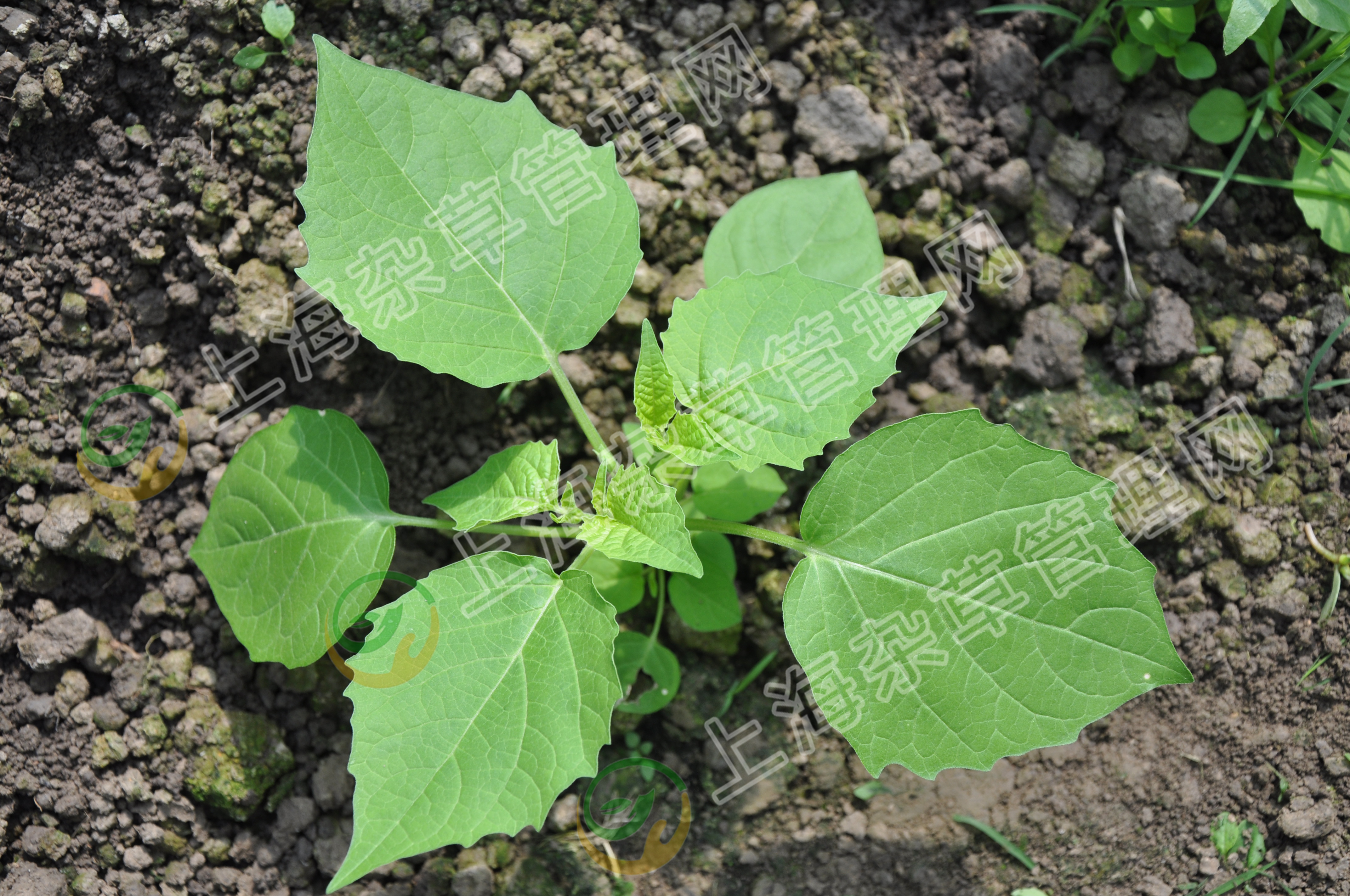 【识别特征】子叶阔卵形,边缘生混杂毛,具长柄;下胚轴极发达,密被混杂毛,上胚轴极短;初生叶1片,阔卵形,叶缘生混杂毛,羽毛网脉,密生短柔毛;成株植株粗壮,高0.3-1m,茎直立,多分枝,绿色或紫色;叶卵形,先端短尖,叶基楔形至阔楔形而下延至叶柄;短蝎尾状聚伞花序腋外生,花冠白色,辐状,5深裂,裂片卵圆形;浆果球形,成熟时黑色;种子近卵形,两侧压扁,淡黄色,表面略具细网纹及小凹穴。花果期9-10月。