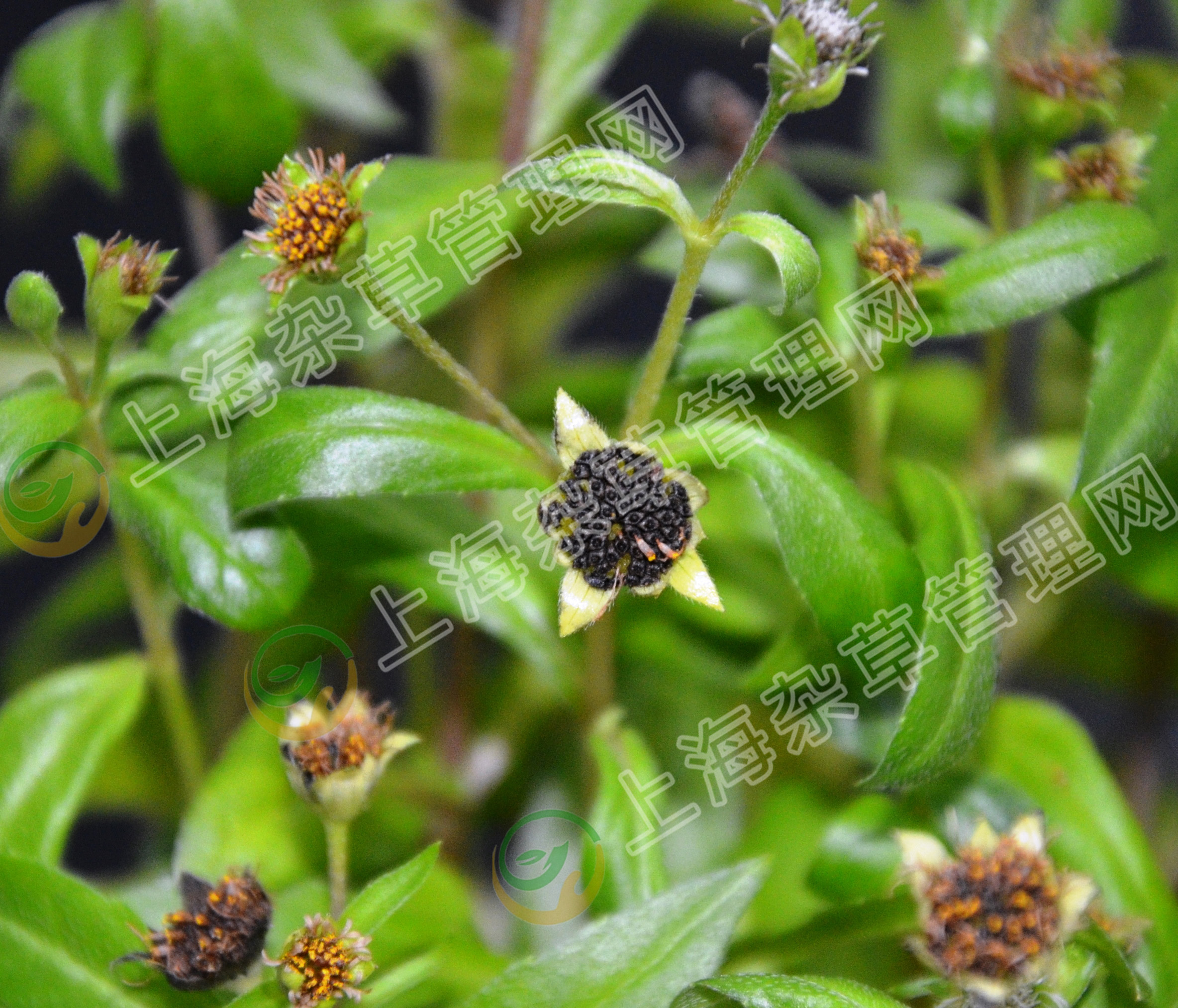 【识别特征】子叶阔卵形,有1条主脉和2条侧脉;上胚轴圆柱状,密被倒生糙毛;初生2叶,对生,三出脉,具长柄;成株全株具褐色水汁;茎直立,下部伏卧,节处生根,疏被糙毛;叶对生,叶片椭圆状披针形,基部渐狭而无柄,两面被糙毛;头状花序有梗,绿色,被糙毛,外围花舌状,白色,中央花管状,黄色;全株干后常变为黑褐色;瘦果黑褐色,具三棱或扁四棱状,较肥短,表面有明显的小瘤状突起;花期7-8月,果期8-11月。