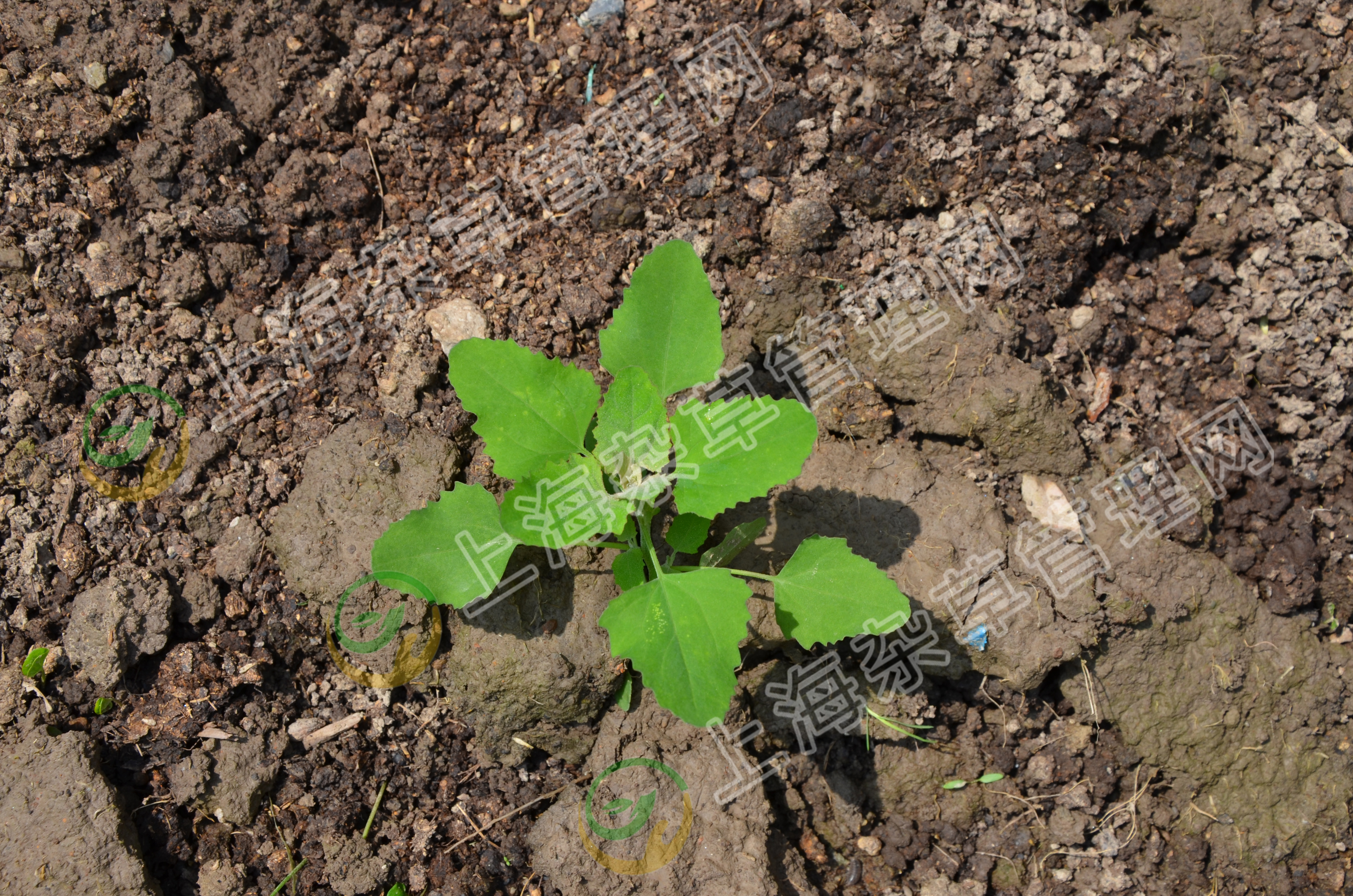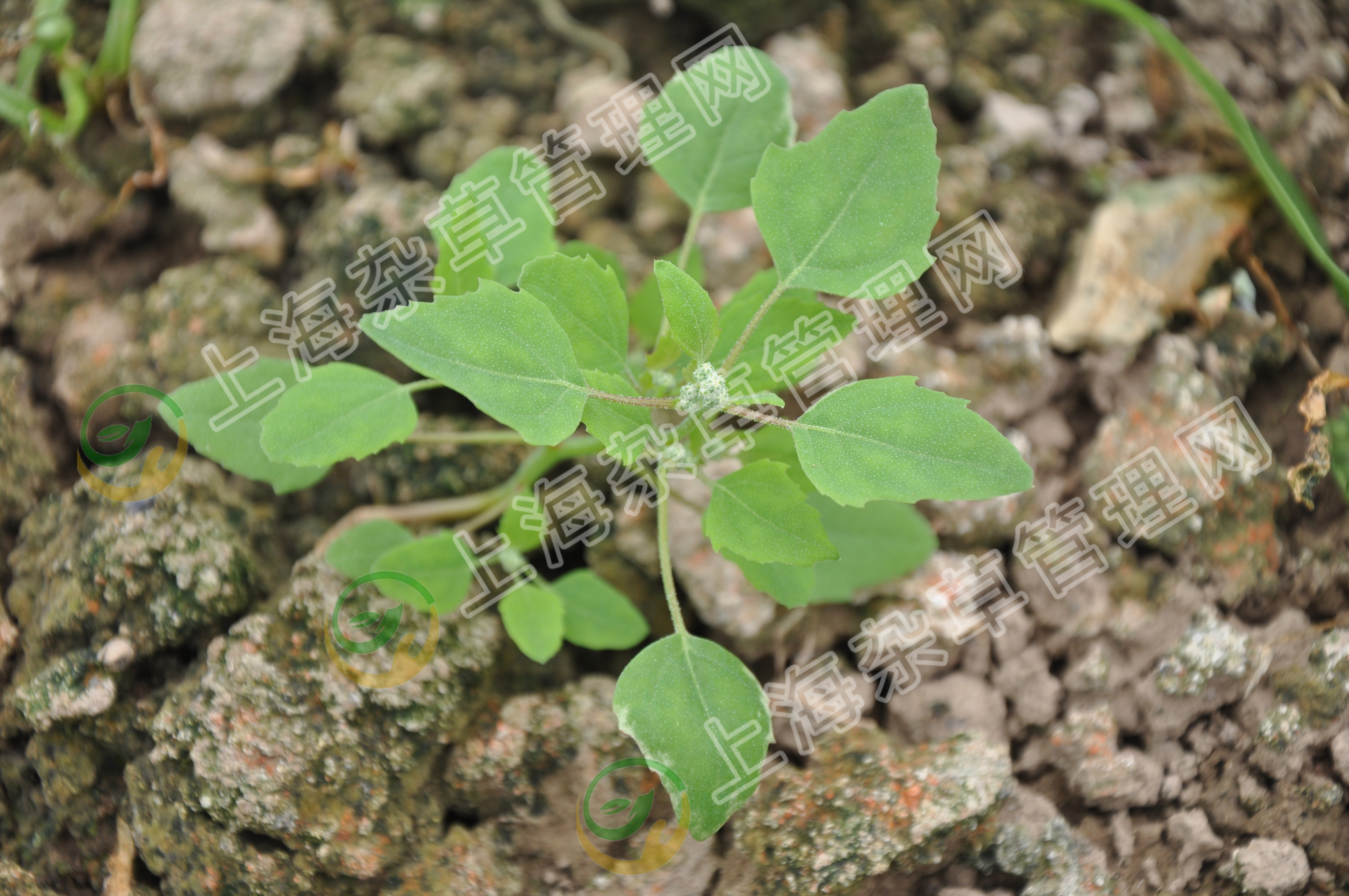 【识别特征】子叶近线形或披针形,略带紫色,叶下面有白粉;初生叶2片,长卵形,主脉明显,叶片下面多呈紫红色,具白粉;上胚轴及下胚轴均较发达,紫红色;成株高60-120cm,茎直立,有棱和纵条纹;叶互生,有长柄,叶片棱状卵形至宽披针形,叶缘具不整齐锯齿,下面生有粉粒,灰绿色;数个花集成团伞花簇排成圆锥状花序,花黄绿色,花被片5,宽卵形至椭圆形;胞果;种子双凸镜形,黑色,有光泽,表明具浅沟纹。花果期5-10月。