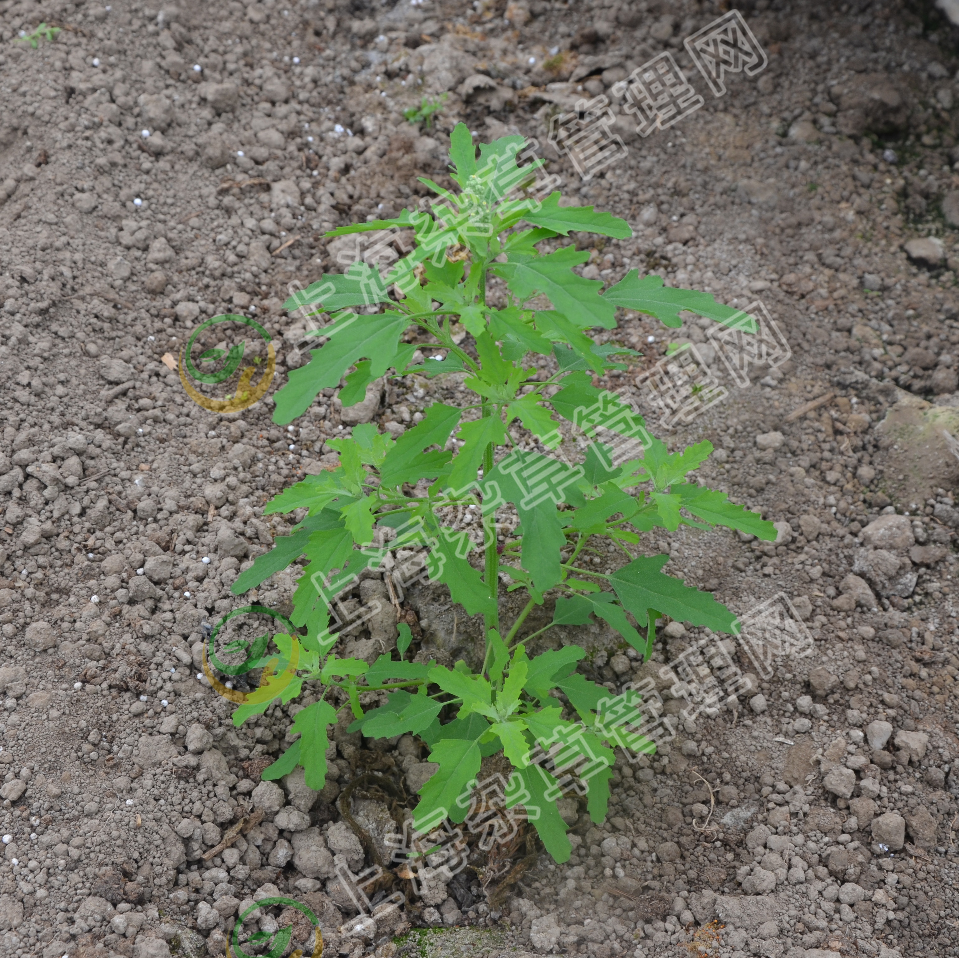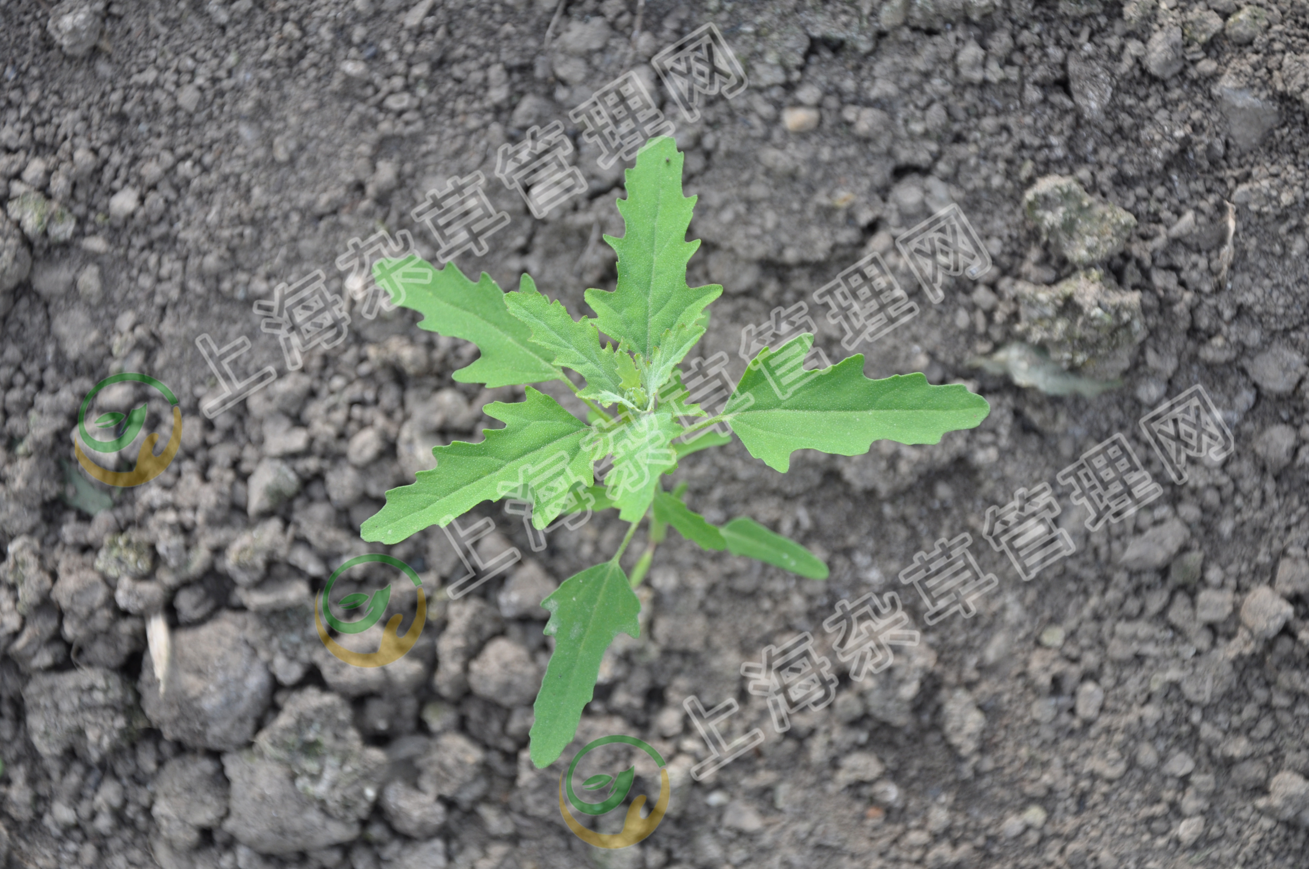 【识别特征】子叶线形,基部紫红色;初生叶2片,线形,叶下面略呈紫红色;下胚轴与上胚轴均较发达,玫瑰红色;成株高20-50cm,茎直立,具绿色总条纹,幼茎常密被粉粒;叶互生,有柄,叶长圆状卵形,先端钝,基部楔形,边缘有波状齿,下部的叶近基部有2个较大的裂片,两面疏生粉粒;花序穗状或圆锥状,花被片5,宽卵形,淡绿色;胞果;种子圆形,双凸镜状,黑色,具光泽,表面有蜂窝状网纹。花期4-6月,果期5-7月。