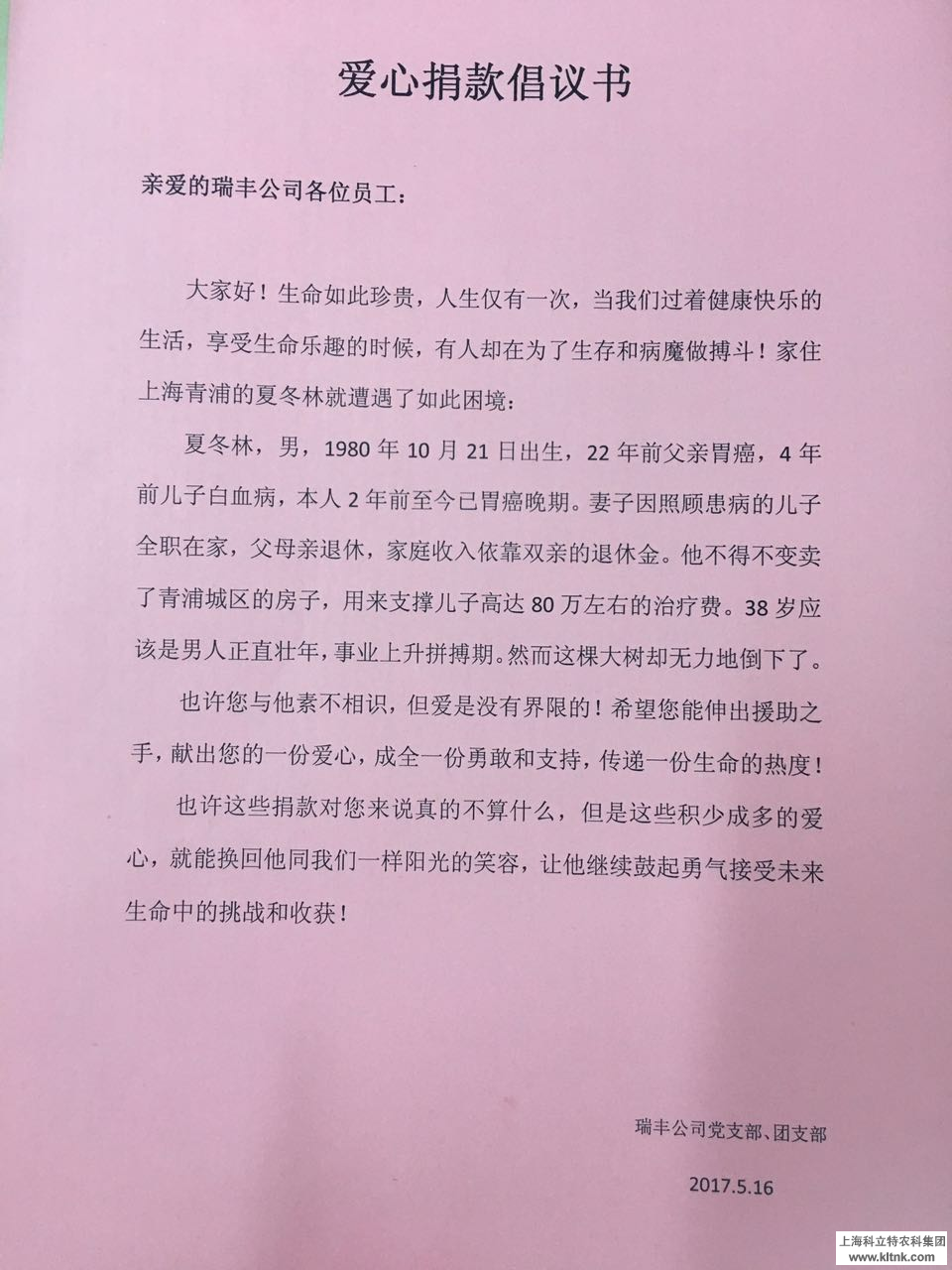 家住青浦区朱家角镇的夏冬林一家生活困苦,其父多年前就患上胃癌,儿子4年前被查出白血病,妻子只能全职在家照顾一家老小。然而命运再次捉弄,夏冬林2年前也患上胃癌,家里唯一的经济来源仅剩父母微薄的退休金。面对一家3人巨额医疗费,夏冬林不得不变卖青浦城区的房子维持日常开支。 得知此消息以后,瑞丰公司党支部及公司团员青年近期在单位发出了爱心捐款倡议书,并得到了员工的积极响应,共筹得善款6000元。5月17日上午,瑞丰公司员工代表驱车前往青浦,在当地村委干部的带领下,亲切慰问夏冬林一家并送了捐款和公司的灵芝破壁孢子粉等产品。 这次的爱心捐款在一家人面临的巨额医疗费中如杯水车薪,但瑞丰公司党员及青年们真诚的希望这积少成多的爱心,能为一家人未来的生活带来一份鼓励,带来一份希望! ![]() ![]() ![]() |