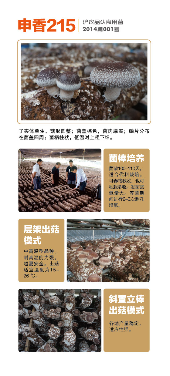 栽培(养殖)技术要点:“申香215”属中高温、长菌龄品种,适合在全国范围内用于香菇代料栽培。根据栽培地区合理安排接种期。菌丝生长适宜温度为20-25℃,培菌期间进行2-3次刺孔通气,发菌需氧量大;菌棒表面出现瘤状物后进入转色管理,现蕾后脱袋出菇,出菇适宜温度为15-25℃,可作层架管理或者斜置立棒出菇管理。做好发菌棚和出菇棚的消毒工作,发现杂菌污染及时清理。