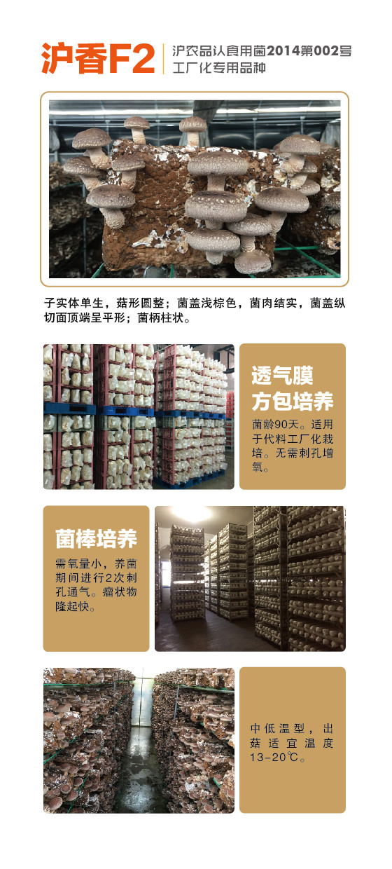 栽培(养殖)技术要点:“沪香F2”属中温型、中菌龄型品种,适合于代料工厂化生产。菌丝生长适宜温度为22-25℃,出菇适宜温度为16-23℃;菌龄85-90天,菌包培养30天后保持每日10小时照明,第40-45天时开始转色。第80天至90天时转色完成,菌皮稍带韧性,即可脱袋出菇。催蕾温度19-20℃,保持室内通风与照明。菇蕾形成后,可降低温度至16℃使菇蕾保持整齐强壮。二氧化碳浓度1500ppm以下。