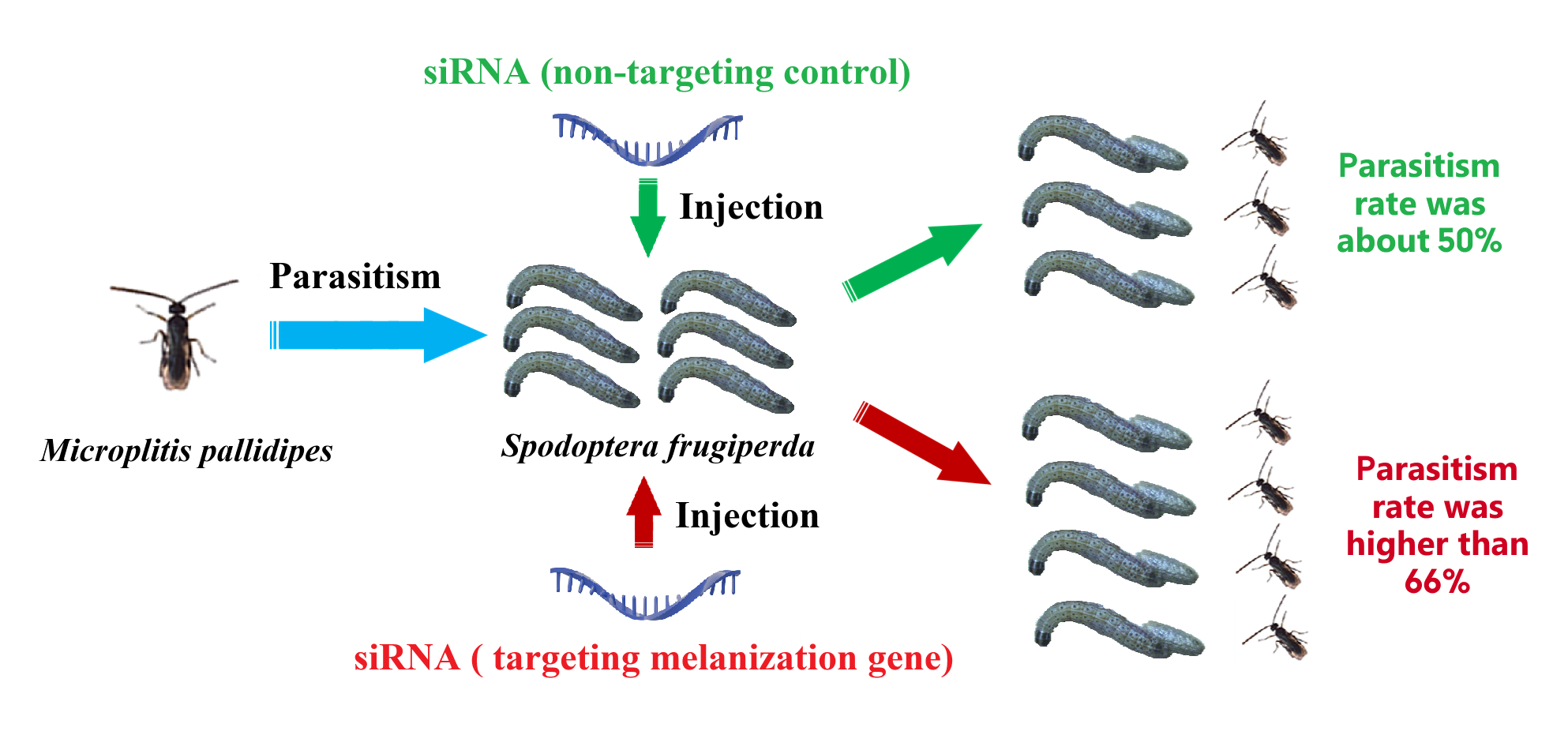该研究聚焦于重大农业害虫草地贪夜蛾与其寄生蜂淡足侧沟茧蜂的免疫互作机理。研究发现,淡足侧沟茧蜂的寄生会显著抑制草地贪夜蛾幼虫的血淋巴黑化及酚氧化酶活性。组学分析表明,寄生后共有1128个基因和594个蛋白的表达发生显著改变。对12个黑化相关基因进行siRNA处理后有8个基因显著下调。其中,对PPO基因和TH基因进行RNA干扰后,寄生蜂的寄生率提高了13.3%–23.3%,血淋巴黑化率降低了36.7%–66.7%。本研究揭示了草地贪夜蛾的黑化免疫反应机制,并明确了在该过程中起关键作用的基因。这些发现为利用寄生蜂进行害虫生物防治提供了应用参考。