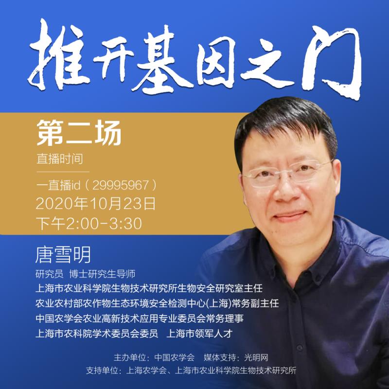 下午,在廖丹凤副处长策划和协助安排下,生物所唐雪明研究员开设题为《推开基因之门》的转基因科普直播讲座,这是我院与中国农学会联合开展的全国转基因科普巡讲(上海站)的第二场线上直播课。在1个半小时的网络直播中,唐雪明研究员介绍了生物所转基因科普场馆,展示了转基因VR体验,深入浅出地讲解了现代生物技术的发展趋势、全球转基因产品发展状况、我国农业领域面临的新形势、新挑战等内容,并指出转基因技术已经成为成熟的技术手段,而以基因沉默技术、基因编辑技术和信息技术为底层技术搭建的合成生物学技术,将在全球农业领域掀起新的绿色革命。直播课观众反响热烈,累计观看人数达309万。