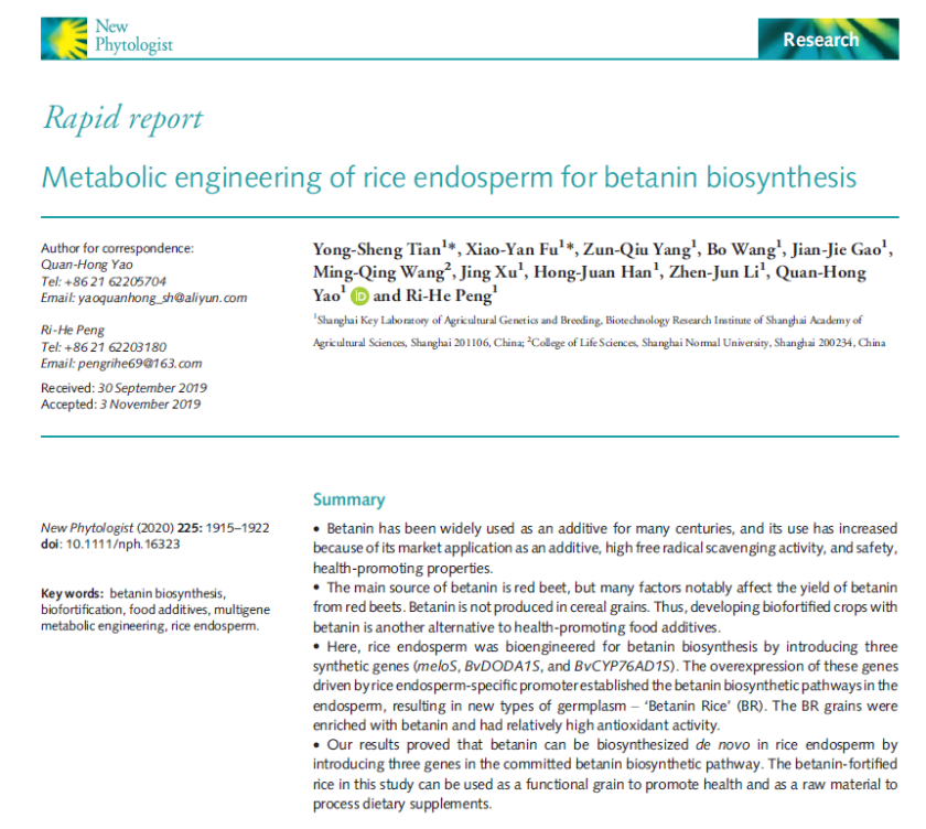 近日,由我院生物技术研究所姚泉洪研究员、彭日荷研究员领衔的合成生物学团队在期刊 New Phytologist(一区Top,IF=8.51)在线发表了题为 “Metabolic engineering of rice endosperm for betanin biosynthesis”的研究论文。