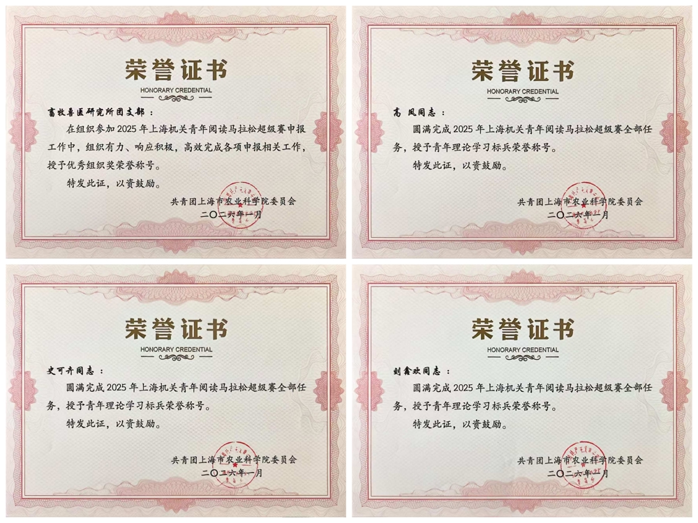 2025年上海机关青年阅读马拉松超级赛近日收官,上海市农业科学院畜牧兽医研究所青年职工积极参与,荣获佳绩。高凤、史可卉、刘鑫欢三名青年科研人员认真备赛、坚持完成全程赛事,凭借持续的理论积累和坚韧的阅读毅力,获评“青年理论学习标兵”荣誉称号。畜牧兽医研究所团支部积极组织、全程保障,展现出良好的学习风貌与团队凝聚力,荣获赛事“优秀组织奖”。