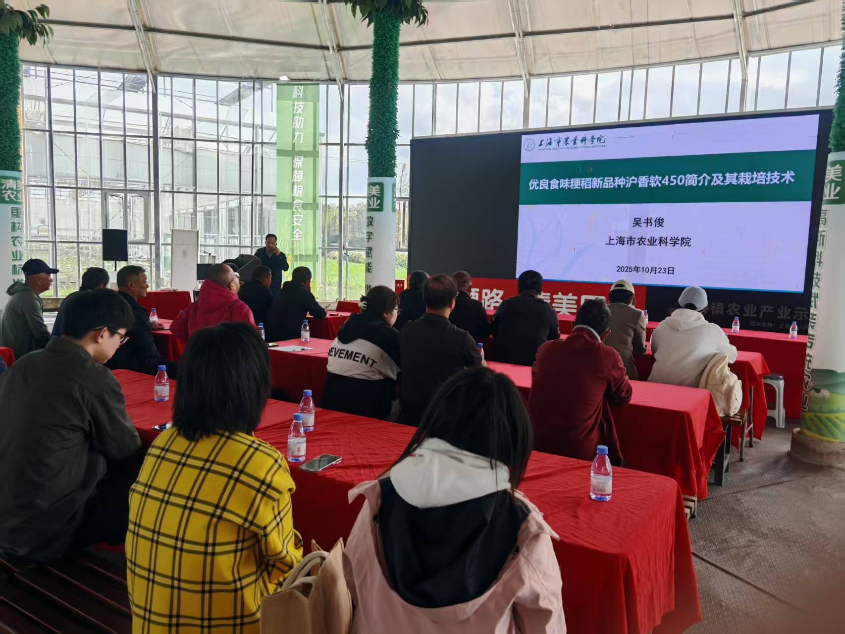 10月23日,作物所在上海清美农业科技有限公司腰路村5G智慧农业基地,成功举办了优良食味粳稻新品种“沪香软450”示范观摩与实割测产现场会。“沪香软450”由作物所水稻中心联合浦东新区农技中心合作选育,于2024年通过上海市品种审定,兼具优良食味与高产两大核心优势,并于2025年以100万元+销售提成的总价成功转让给浙江大禾种业有限公司。浦东新区农技中心组织了全区优质稻米开发重点乡镇农技人员和种植大户30余人进行了示范现场观摩,作物所副所长、该品种培育者吴书俊研究员详细介绍了“沪香软450”的品种特点、种植技术关键技术及田间管理注意事项。同时来自上海市、浦东新区、金山区和松江区两级农技中心的5位专家现场开展测产,结果显示:“沪香软 450”2个测产点的亩产分别为681.5和660.1公斤,在今年高温气候下产量表现亮眼。在随后的沪香软450品鉴环节中,专家团队、浦东新区各街镇农业条线人员及种植户共同品鉴“沪香软450”米饭,大家对其食味口感给予一致好评,不少种植户现场表示,计划来年新增或扩大该品种种植面积。