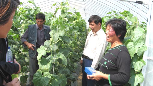 考察时,陈幼源研究员还对在大棚里忙碌的网纹瓜瓜农进行了现场指导。