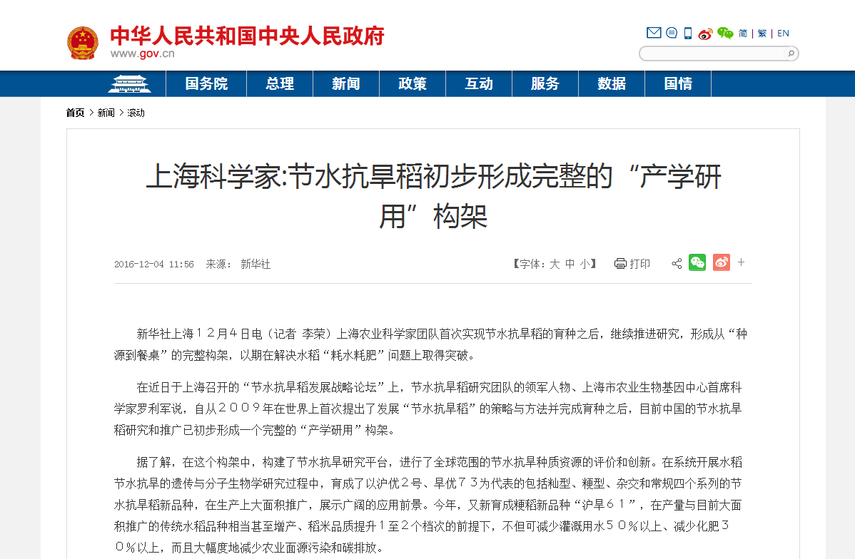 据了解,在这个构架中,构建了节水抗旱研究平台,进行了全球范围的节水抗旱种质资源的评价和创新。在系统开展水稻节水抗旱的遗传与分子生物学研究过程中,育成了以沪优2号、旱优73为代表的包括籼型、粳型、杂交和常规四个系列的节水抗旱稻新品种,在生产上大面积推广,展示广阔的应用前景。今年,又新育成粳稻新品种“沪旱61”,在产量与目前大面积推广的传统水稻品种相当甚至增产、稻米品质提升1至2个档次的前提下,不但可减少灌溉用水50%以上、减少化肥30%以上,而且大幅度地减少农业面源污染和碳排放。