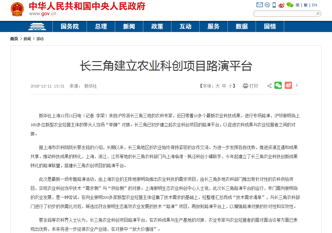 据上海市农科院院长蔡友铭的介绍,长期以来,长三角地区的农业始终保持紧密的合作交流。为进一步发挥各自优势,推进资源互通和成果共享,推动科技成果的转化,上海、浙江、江苏等地的长三角农科部门与上海临港·枫泾科创小镇联手,今年起建立了长三角农业科技创新成果转化的路演联盟,搭建长三角农创项目的路演平台。