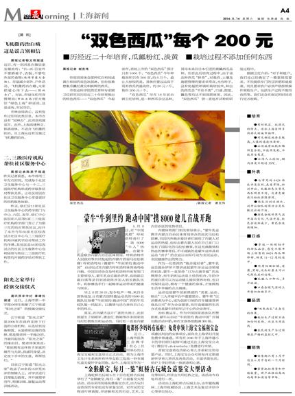 市农业科学院西瓜育种专家顾卫红研究员历经近二十年培育推出的特色西瓜——“双色西瓜”今起面市,首批上市的“双色西瓜”预计只有1000个。“双色西瓜”今年种植面积只有300亩,约8万个。最让人惊叹的是,其售价要远远高于现有西瓜的最高价,约20元/斤,售价200元/个。