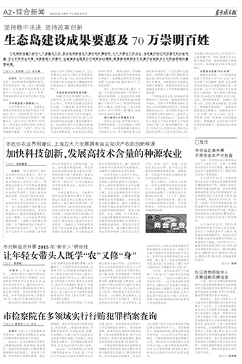 今年,是上海推动建设具有全球影响力的科技创新中心启始年,对上海这座特大型的城市来说,农业科技体系建设,也是科技创新中心建设的重要组成部分。记者了解到,从去年农业界别的调研来看,上海的土地资源非常有限。为了确保城市的正常运行,在市委市政府领导下,地产优质农产品的生产也为保障上海市场的有效供给作出了积极贡献。但是,如果离开财政补贴,郊区农民的收益提高就难以稳定实现。要想在较少的土地资源上创造出更大价值,让农民有更大的收益,委员们一致认为,大力发展高技术含量的种源农业,是切实可行的途径之一。