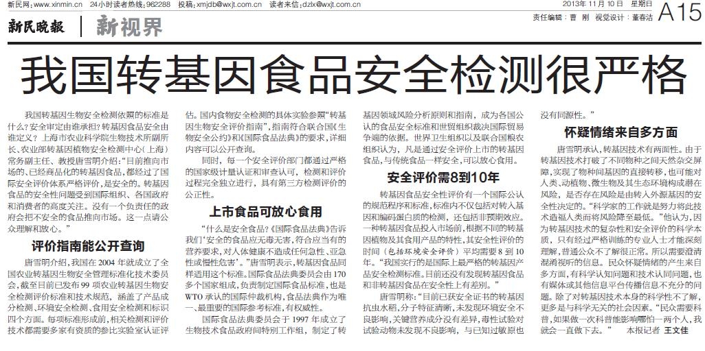 唐雪明介绍,我国在2004年就成立了全国农业转基因生物安全管理标准化技术委员会,截至目前已发布99项农业转基因生物安全检测评价标准和技术规范,涵盖了产品成分检测、环境安全检测、食用安全检测和标识四个方面。每项标准形成前,相关检测和评价技术都需要多家有资质的参比实验室认证评估。国内食物安全检测的具体实验参照“转基因生物安全评价指南”,指南符合联合国《生物安全公约》和《国际食品法典》的要求,详细内容可以公开查询。