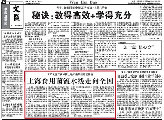 本报讯 (记者任荃)最近,上海市农科院食用菌研究所忙着接待一批批来自全国各地的访客。有意思的是,来访者不再满足于购买优质菌种,转而邀请所里的科技人员上门为其建一座标准化的食用菌工厂。因为,有了上海研发的流水线,原本每年只收一两茬的金针菇、杏鲍菇,就可每天采摘,亩产值超50万元。