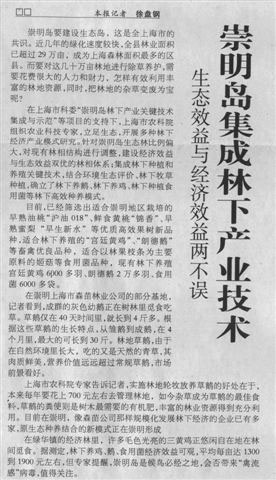 在上海市科委“崇明岛林下产业关键技术集成与示范”等项目的支持下,上海市农科院组织农业科技专家,立足生态,开展多种林下经济产业模式研究。针对崇明岛生态林比例偏大,对现有林相结构进行调整,建设经济效益与生态效益双优的林相体系;集成林下种植和养殖关键技术,结合环境生态评价、林下牧草种植,确立了林下养鹅、林下养鸡、林下种植食用菌等林下高效种养模式。
