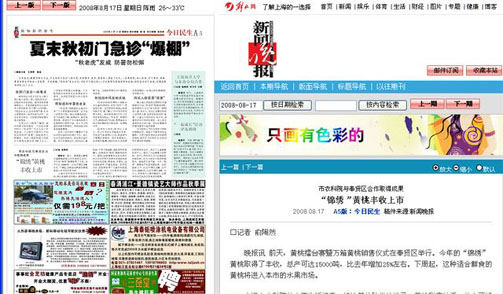 近年来,奉贤区青村镇和市农科院林果所合作,成立了上海黄桃研发中心,建立了万亩黄桃示范基地。该中心的科研人员不但继续培育新品种,还为当地农户指导种植技术,提高果实的产量。今年,“锦绣”黄桃亩产有望突破纪录,达到2100公斤,比去年增加20%,总产可达15000吨,比去年增加25%。仪式上,多家商户与青村镇签约,让更多的市民能品尝到奉贤的黄桃。