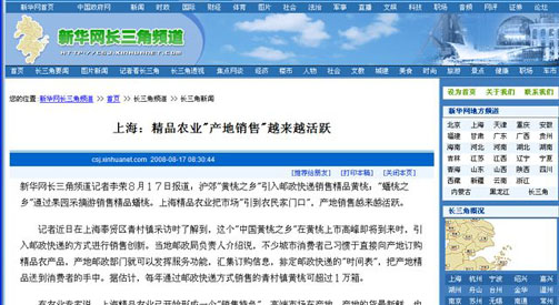 新华网长三角频道记者李荣8月17日报道:沪郊"黄桃之乡"引入邮政快递销售精品黄桃;"蟠桃之乡"通过果园采摘游销售精品蟠桃。上海精品农业把市场"引到农民家门口",产地销售越来越活跃。