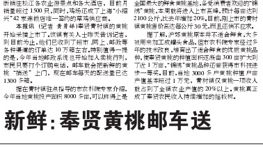 本报讯 (记者 黄勇娣)奉贤青村镇的黄桃开始采摘上市了。该镇有关人士昨天告诉记者,到目前为止,他们已收到了超市、网上、邮政等各种渠道的订单达10万箱左右。特别值得一提的是,今年当地邮政系统也开始加入卖桃行列,市民只要打个订购电话,邮车就会把新鲜的黄桃“捎送”上门,现在邮车每天的配送量已达1300多箱。