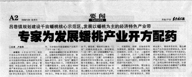本报讯 1月21日下午,来自中国农业科学院郑州果树研究所、江苏省农业科学院园艺研究所、北京市农林科学院林业果树研究所和上海农业科学院、绿化(林业)管理局、林业总站的10多位专家,冒着严寒来到金山区吕巷镇和平村的蟠桃种植基地,为等候在那里的120多位果农进行了现场培训和指导,为该镇如何做强蟠桃产业既开了方子又配了药。