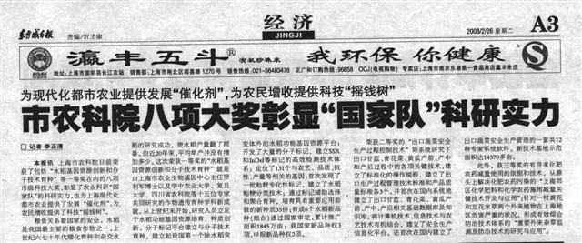 本报讯上海市农科院日前荣获了包括“水稻基因资源创新和分子技术育种”等一等奖在内的八项市级科技大奖,彰显了农业科研“国家队”的科研实力,也为上海现代化都市农业提供了发展“催化剂”,为农民增收提供了科技“摇钱树”。