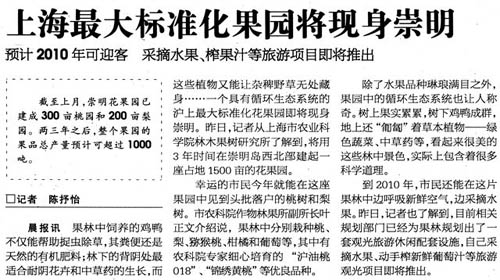 晨报讯 果林中饲养的鸡鸭不仅能帮助捉虫除草,其粪便还是天然的有机肥料;林下的背阴处最适合耐阴花卉和中草药的生长,而这些植物又能让杂稗野草无处藏身……一个具有循环生态系统的沪上最大标准化花果园即将现身崇明。昨日,记者从上海市农业科学院林木果树研究所了解到,将用3年时间在崇明岛西北部建起一座占地1500亩的花果园。