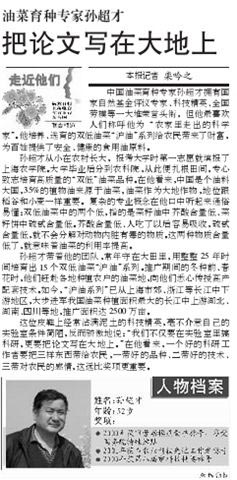 中国油菜育种专家孙超才拥有国家自然基金评议专家、科技精英、全国劳模等一大堆荣誉头衔,但他最喜欢人们称呼他为“农家里走出的科学家”。他培养、选育的双低油菜“沪油”系列给农民带来了财富,为百姓提供了安全、健康的食用油原料。