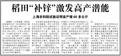 按照“缺啥补啥”的思路,科研人员为稻田开出了“进补”处方:在保持相同的氮、磷、钾元素施用量的情况下,对每 亩实验田施加1公斤锌肥。谁知到了丰收时节,这价值2.8元的1公斤锌肥,让农民每亩多收获了120多元的稻谷。据初步估算,若崇明全岛50万亩稻田都补 点锌,就能增收数千万元,回报十分可观。