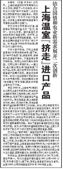 本报讯 (记者 黄勇娣)这几天,上海的温室研究专家周强刚从日本归来,带回了一个好消息:日本知名休闲园“神户花鸟园”,决定放弃从西欧国家进口温室装备,而改向上海订购3万平方米的大型温室。这将是上海高端玻璃温室首次凭借自主品牌走出国门。