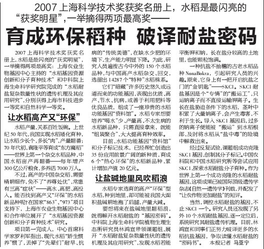 2007上海科学技术奖获奖名册上,水稻是最闪亮的“获奖明星”,一举摘得两项最高奖:上海农业生物基因中心主持的“水稻基因资源创新和分子育种技术”和中科院上海生命科学研究院完成的“水稻耐盐复杂数量性状的遗传机理及其应用研究”,分别获得上海市科技进步一等奖和自然科学一等奖。