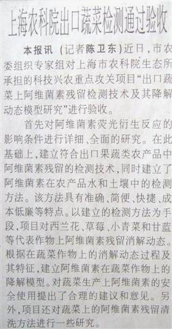 本报讯(记者 陈卫东)近日,市农委组织专家组对生态所承担的上海市科技兴农重点攻关项目 “出口蔬菜上阿维菌素残留检测技术及其降解动态模型研究”进行了验收。