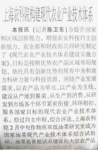 本报讯(记者 陈卫东)为提升国家和区域创新能力,增强农业科技自主创新能力,农业部和财政部共同研究制定了《现代农业产业技术体系建设实施方案》,目标是按照优势农产品区域布局规划,依托具有创新优势的现有中央和地方科研力量与科技资源,围绕产业发展需求,以农产品为单元,以产业为主线,建设从产地到餐桌、从生产到消费、从研发到市场各个环节紧密衔接、环环相扣、服务国家目标的现代农业产业技术体系。经过自主申报,综合评选,上海农科院2月中旬作物所双低油菜研究室成为国家油菜现代产业技术体系综合试验站,油菜是首批试点建设的大宗农产品之一。