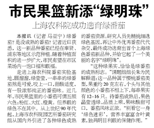 走进上海农科院番茄实验基地,圆溜溜,绿莹莹,一串串的绿番茄煞是可爱,咬上一口,甜酸适度,有一股浓郁纯正的番茄味。近几年,市民果篮里的小番茄可谓五颜六色:粉红、大红、橙黄。但养眼的绿色不在其中。从上世纪90年代起,上海市农科院园艺所番茄研究组从国内外引进了各种绿色成熟的番茄资源。研究人员先精挑细选绿色基因,再让中外优秀番茄代代杂交,最终成功选育出首个上海绿色番茄新品种,并给它起了一个美丽的名字“绿明珠”。
