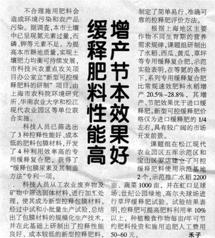 不合理施用肥料会造成环境污染和农产品污染。据调查,本市土壤中已呈现氮元素过量,而磷、钾等元素不足。为提高本市耕地质量,实现土壤肥力均衡可持续发展,市科技兴农重点攻关项目办公室立“新型可控缓释肥料的研制”项目,由上海市农科院环境研究所,华南农业大学和松江现代农业园区等单位联合实施。