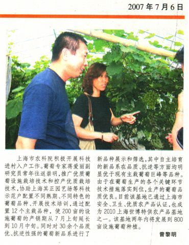 上海市农科院积极开展科技进村入户工作。葡萄专家蒋爱丽副研究员常年往返崇明,推广优质葡萄设施栽培技术和控产优质栽培技术,协助上海其正园艺场等科技示范户配置不同熟期、不同特色的葡萄品种、开展技术培训,通过配置12个主栽品种,使200亩的设施葡萄的产销期从7月上旬延长到10月中旬。同时对30余个品质优、抗逆性强的葡萄新品系进行了新品种展示和筛选,其中自主培育的新品系在品质、抗逆等方面均明显优于现有主栽葡萄巨峰等品种。由于在葡萄生产的各个关键环节技术措施落实到位,生产的葡萄品质优良。目前该基地已通过上海市安全、卫生、优质农产品认证,也成为2010上海世博特供农产品基地之一。该基地两年内将发展到800亩设施葡萄种植。