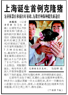 为何选择巴马香猪作为克隆对象?课题组另一位主持人上海交大医学院附属新华医院发育生物学研究中心陈学进副教授解释说,巴马香猪成年体重在50公斤左右,其内脏器官的生理功能和形态大小也与人体器官相似,被认为是开展人异种器官移植的理想供体。而且,巴马香猪是近亲交配的猪,遗传性能稳定,有利于提高遗传实验的准确性。当然,等克隆技术成熟后,人们还可对其他品种的猪进行克隆,通过“拷贝不走样”,就能在地方良种猪的种质资源保存上有所突破。