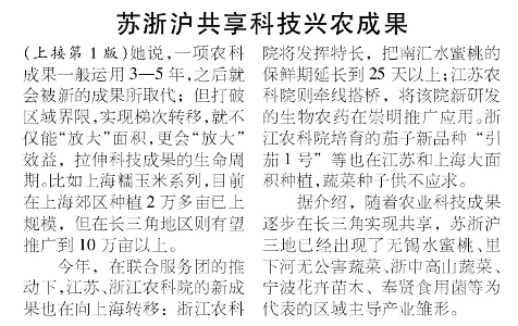今年,在联合服务团的推动下,江苏、浙江农科院的新成果也在向上海转移:浙江农科院将发挥特长,把南汇水蜜桃的保鲜期延长到25天以上;江苏农科院则牵线搭桥,将该院新研发的生物农药在崇明推广应用。浙江农科院培育的茄子新品种“引茄1号”等也在江苏和上海大面积种植,蔬菜种子供不应求。