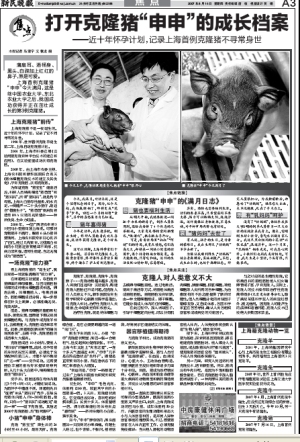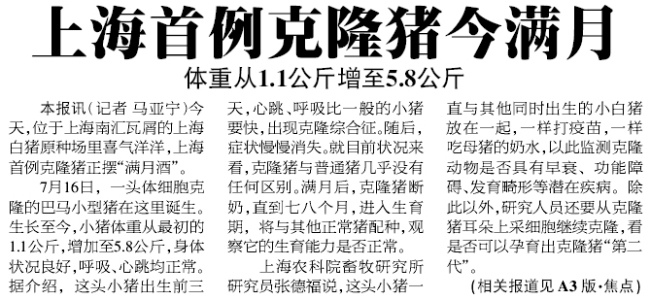 上海首例克隆猪“申申”今天满月,这是继中国农业大学、东北农业大学之后,我国成功获得并正在茁壮成长的第3例克隆猪。