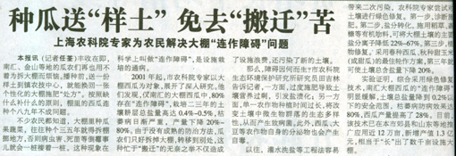 实验证明,综合采用绿色修复技术,南汇大棚西瓜的“连作障碍”明显缓解,土壤总盐量降到0.2%以下的安全范围,枯萎病防病效果达80%,西瓜产量提高了28%。目前,该技术已在本市郊县和山东等地推广应用近12万亩,新增产值1.3亿元,相当于“长”出了数千亩设施大棚。