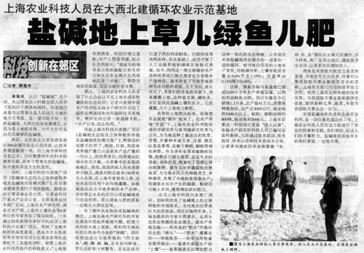 这项上海市科技兴农推广项目,创新和改良了盐碱地上的立体种植和养殖体系,为当地农民带来巨大经济效益。项目实施两年来,上海各路农科专家不畏艰辛;运用生态农业和循环农业理念,建水产养殖设施——将养鱼的“肥水”作循环农业的“源头”——“肥水”灌溉农田——种植牧草——牧草饲养牲畜发展养殖业——畜粪作菌菇生产的“土壤”——畜粪菌渣还田增加肥这种一体化的生态种植,以养殖技术和盐碱地改良模式的一道紧扣一道的循环,使当地白花花的土地有了变化,经检测分析,土壤有机质含量由0.6%升至1.15%;含盐率由5.11%降至0.45%。