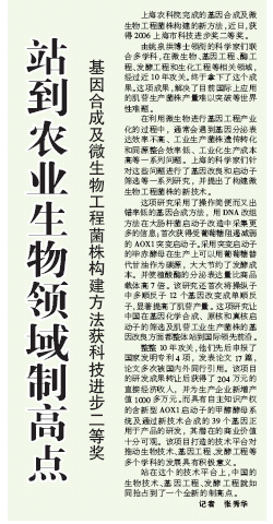 上海农科院完成的基因合成及微生物工程菌株构建的新方法,近日,获得2006上海市科技进步奖二等奖。