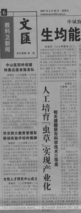 记者近日从上海市中医药行业协会与市农科院等联合召开的研讨会上获悉,历经17年的研究,一种可大规模人工培育、价格仅为现市场价十分之一,且成分、药性与冬虫夏草相仿或相当的北冬虫夏草已成功实现了科技成果产业化。作为科技部农业科技成果转化项目,该项研究近日荣获“上海市科学技术奖”三等奖。
