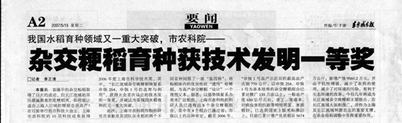 记者:本报讯 袁隆平的杂交籼稻取得了巨大的成功,但长江流域的居民普遍都喜欢吃粳稻米,如何能让适合上海人口味的粳稻也获高产?在日前举行的市科技大会上,上海市农科院的10项科技成果获得2006年度上海市科学技术奖,其中,“长江流域杂交晚粳稻恢复系申恢254、申恢1号的选育与利用”,获得大会首次设立的技术发明一等奖,并被认为是我国水稻育种的又一重大突破。
