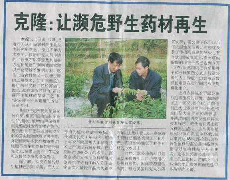上海农科院对于雷公藤细胞再生株的研发,却能改变这一状况。据介绍,目前他们已找出能够顺利长出愈伤组织及大量生长的培养基,并通过细胞诱变及植株再生技术程序,较快地获得上百万株再生植株。这些再生植株的种苗在温室中移栽,成活率高达85%。经检验,这些再生植株的雷公藤内酯醇含量与野生植株持平甚至更高。这不但为雷公藤提供临床上的新选择,还解决了因环境的变迁或限制而无法取得药材的困境。