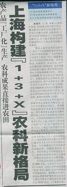 本报讯(记者刘颖)记者昨天获悉,围绕建设现代都市农业、建设新郊区新农村的战略目标,本市正在整合资源、创新机制,打造“1+3+x”新格局:1个农业科技创新中心、3个综合性的专业科研基地和几十个农业科技试验示范基地。
